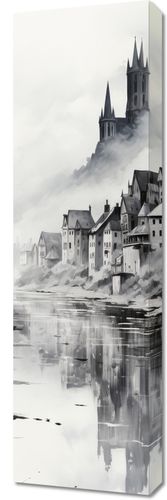 Obraz z serii pejzaże zatytułowany Mglisty Refleks. Misterne pociągnięcia pędzla przedstawiają starą wieś schowaną w mrocznych zakątkach gór, z dominującymi wieżami kościoła wznoszącymi się nad nią. Mgła otulająca krajobraz i odbicie w spokojnej wodzie tworzą atmosferę tajemniczości i zadumy. Monochromatyczna paleta barw dodaje głębi i intensywności całemu obrazowi, czyniąc go idealnym wyborem dla klasycznych salonów oraz miejsc takich jak kawiarnie o historycznym charakterze czy ekskluzywne kluby dyskusyjne.