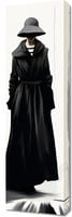 Obraz z serii wnętrza zatytułowany Mroczna Taina. Enigmatyczna postać w czarnym płaszczu i szerokim kapeluszu ukrywa swoją tożsamość, podkreślając aura tajemniczości. Czarno-białe tło z pionowymi smugami przypominającymi deszcz lub płynący atrament dodaje głębi i dramatyzmu kompozycji. Subtelne niuanse światła i cienia grają na powierzchni płaszcza, tworząc atmosferę intrygi i nieokreślonego niebezpieczeństwa. Świetnie sprawdzi się w nowoczesnych galeriach sztuki, luksusowych hotelach o minimalistycznym designie oraz w przestrzeniach przeznaczonych dla miłośników noir i kryminałów.