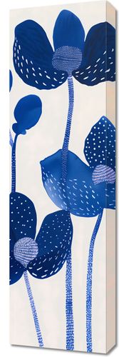 Obraz z serii wnętrza zatytułowany Nocne Kwiaty to odważne, graficzne przedstawienie kwiatów w monochromatycznej palecie kolorów granatowych. Kwiaty o stylizowanych formach i różnorodnych fakturach wyłaniają się na tle w delikatnym odcieniu, co dodaje kompozycji spokojnego, ale zarazem wyrazistego charakteru. Sploty i kropki na płatkach kwiatów tworzą iluzję głębi i tekstury, a ich symetryczny rozmieszczenie nadaje plakatowi rytmicznej harmonii. Ten obraz jest wyrafinowany i współczesny, idealny dla przestrzeni szukających minimalistycznej, ale odważnej dekoracji ściennych, takich jak nowoczesne biura, eleganckie salony czy jako wyjątkowy element w galeriach sztuki.