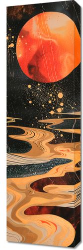 Obraz z serii abstrakcja zatytułowany Planetarny Taniec. Prezentuje on oniryczną scenerię, w której złoto-czerwone rzeki snują się przez kosmiczną przestrzeń, prowadząc do majestatycznego, czerwonego słońca. Wzburzone złote drobinki i linie przypominające galaktyczne falowania dodają głębi i dynamiki, tworząc wrażenie ruchu i niekończącej się podróży przez wszechświat. Ten obraz, z jego abstrakcyjnymi formami i bogatą kolorystyką, może stanowić centrum uwagi w nowoczesnych wnętrzach, inspirując do refleksji nad niezgłębionym pięknem kosmosu. Idealny dla miłośników astronomii, science fiction oraz wszystkich, którzy chcą dodać swoim przestrzeniom odrobinę kosmicznego majestatu.