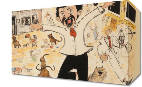 Obraz z serii pejzaże u00a0zatytułowany Chaos w Miasteczku. Ekscytująca scena pełna dynamicznych postaci i zwierząt wydaje się być niekończącym się źródłem zabawy i śmiechu. Główny bohater z szeroko otwartymi oczami i wyraźnym wyrazem twarzy zdaje się być zaskoczony otaczającym go bałaganem, podczas gdy psie postacie dodają uroku i komizmu całemu obrazowi. Kolorowe detale, takie jak budynki, zabawki i codzienne przedmioty, tworzą żywą i zabawną atmosferę. Świetnie sprawdzi się w pokojach dziecięcych, kawiarniach tematycznych oraz miejscach dedykowanych humorowi i rozrywce.
