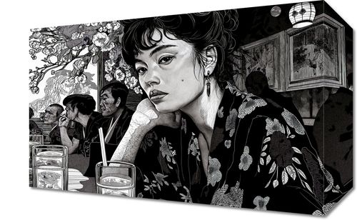Obraz z serii motywy wschodnie zatytułowany Czarne Kimono. Przedstawia on czarno-białą scenę w restauracji, w której centralną postacią jest młoda kobieta o intensywnym spojrzeniu, ubrana w tradycyjny, kwiecisty kimono. Jej postać wyróżnia się na tle pozostałych gości, a szczegółowa grafika podkreśla wyraźne detale jej stroju i delikatnych rysów twarzy. Tło, zdobione motywem kwiatowym, nadaje głębi i kontekstu kulturowego, a całość kompozycji wywołuje atmosferę introspekcji i spokoju. Ten obraz idealnie nadaje się do wnętrz, które chcą oddać hołd klasycznej estetyce Dalekiego Wschodu lub po prostu wprowadzić element zastanowienia i piękna. Doskonale wpasuje się w przestrzenie takie jak salon, gabinet, a nawet miejsca publiczne, które pragną zapewnić swoim gościom wizualny odpoczynek i chwilę zadumy.