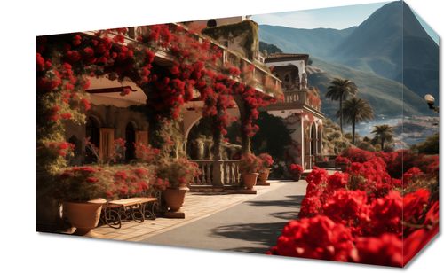Obraz z serii pejzaże zatytułowany Czerwona Idylla, przedstawia romantyczną scenę otuloną w bujne, kwitnące bougainvillea, które zdobią klasyczną architekturę z widokiem na malownicze wzgórza. Czerwone kwiaty przypominające klejnoty, kontrastujące z ciepłą paletą pastelowych ścian i żywej zieleni, przywołują uczucie wiecznego lata. To arcydzieło znakomicie komponowałoby się w przestronnych, jasnych przestrzeniach, takich jak rezydencje w stylu śródziemnomorskim, ekskluzywne spa czy jako element wyróżniający w eleganckich restauracjach, zapraszając do marzeń o długich, leniwych dniach nad Morzem Śródziemnym.
