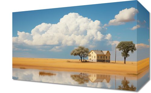 Obraz z serii pejzaże zatytułowany Domostwo, przedstawia idylliczny krajobraz z domem wiejskim, który odzwierciedla siatkę spokoju i prostoty. W centrum sceny znajduje się tradycyjny dom z jasnożółtymi ścianami i dachem w kolorze jasnoszarym, otoczony przez dwa okazałe drzewa oferujące cień i komfort. Płaski, rozległy krajobraz pokryty jest suchą, złotą trawą, która kontrastuje z błękitnym, rozległym niebem usianym puszystymi białymi chmurami. Poniżej, spokojna, błyszcząca tafla wody odbija dom i drzewa, tworząc doskonałe lustrzane odbicie, które dodaje głębi i symetrii kompozycji. Ten obraz przypomina o prostych przyjemnościach życia na wsi, gdzie czas wydaje się płynąć wolniej, a natura jest blisko. Idealnie wpasuje się w przestrzenie, które mają na celu wywołać poczucie spokoju i refleksji, takie jak domowe pokoje wypoczynkowe, gabinety psychoterapeutyczne lub pomieszczenia do medytacji.