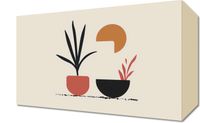 Obraz z serii boho zatytułowany Domowy Ogród. Obraz łączy proste, geometryczne formy roślin z ciepłą kolorystyką, tworząc przytulny obraz domowego ogrodu. Czerwony i czarny wazon z roślinnością wyrastają nad delikatną linia ziemi, przywołując obrazy spokojnego wnętrza. Niedokończony półksiężyc w kolorze pomarańczowym dodaje kompozycji delikatności i podkreśla domową atmosferę. Dzieło doskonale nadaje się do miejsca, które ma być oazą spokoju i relaksu, takiego jak sypialnia lub cichy kącik do czytania. Jego proste i spokojne kolory mogą również przynieść harmonię do miejsca pracy lub studiowania, promując skupienie i spokój.