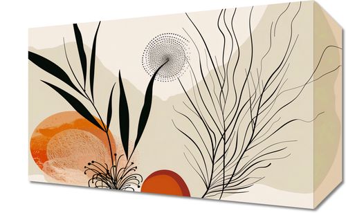 Obraz z serii minimalistyczne zatytułowany Echem przez Pustynie. Obraz przedstawia abstrakcyjny, pustynny pejzaż, gdzie organiczne kształty roślin łączą się z geometrycznymi formami słonecznych dysków. Ciemne, dynamiczne linie roślin przecinają pastelowe tło w kolorach beżu i brązu, tworząc kontrastowe ale harmonijne połączenie. Rozproszone kropki na jednym z elementów wyglądają jak drobinki piasku unoszące się w powietrzu lub delikatne nasiona rośliny gotowe do rozsiania przez wiatr. Ten obraz emanuje ciepłem i naturalnością, doskonale wpisując się w przestrzenie, które cenią sobie spokój, minimalizm i bliskość z naturą. Idealnie sprawdzi się w salonach, poczekalniach, czy jasnych korytarzach, dodając im subtelnej elegancji i organicznego charakteru.