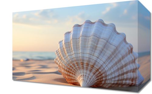 Obraz z serii natura zatytułowany Echo Morza. Delikatne, pastelowe barwy muszli występujące na pierwszym planie, z jej wyraźnymi liniami i subtelnym przejściem kolorów od kremowego do różowego, kontrastują z dynamicznym tłem zachodzącego słońca nad morzem. Złote refleksy światła na wodzie i miękki, piaskowy pierwszy plan tworzą poczucie głębi i spokoju. Idealny do wnętrz o tematyce morskiej, relaksacyjnych spa oraz jako element dekoracyjny w pokojach hotelowych z widokiem na morze.