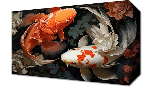 Obraz z serii motywy wschodnie zatytułowany Harmonijny Taniec to arcydzieło, które wyraża subtelność i równowagę przez harmonijne współistnienie natury i sztuki. Dwie ryby koi, jedna w odcieniach płomiennego pomarańczu, druga w pastelowych barwach kremu z akcentami czerwieni, są przedstawione w eleganckim tańcu, który jest tak płynny i gracji jak ruchy baletnicy. Ich delikatne płetwy przypominają falujące tkaniny, unoszące się w wodnym balecie, otoczone przez misternie malowane kwiaty, które dodają całości organicznej głębi. To zmysłowe i prowokujące do refleksji dzieło, które doskonale uzupełni każde wyrafinowane wnętrze, od stylowych kawiarni po intymne przestrzenie prywatne, gdzie design łączy się z naturalnym pięknem.