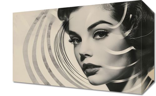 Obraz z serii pop art zatytułowany Ikonka Kina. Przedstawia czarno-białe portretowe zdjęcie klasycznej gwiazdy filmowej, której twarz jest częściowo zakryta przez geometryczny wzór spiralnych linii. Linie te dodają obrazowi dynamiki i nowoczesnego akcentu, kontrastując z retro estetyką portretu. Ten obraz łączy stare z nowym, sugerując zarówno ponadczasową piękność, jak i współczesne spojrzenie na sztukę. Idealny do eleganckich, miejskich przestrzeni lub jako dekoracja dla miłośników klasycznego kina.