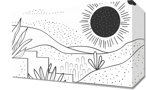 Obraz z serii minimalistyczne zatytułowany Linearny Pejzaż. Obraz przedstawia liniową ilustrację krajobrazu w czerni i bieli, gdzie przestrzeń zapełniają delikatne linie, kropki i abstrakcyjne formy roślinności. Centralnym punktem jest stylizowane słońce z promieniami rozchodzącymi się we wszystkie strony, towarzyszy mu mniejsze ciało niebieskie, które może symbolizować planetę lub księżyc. Lekkie kropki sugerują obecność piasku lub gwiazd, dodając elementu fantazji. Ten obraz wprowadzi do każdej przestrzeni element spokoju i prostoty. Idealnie nadaje się do nowoczesnych przestrzeni, takich jak minimalistyczne biura, jadalnie czy pokoje młodzieżowe, dostarczając neutralnej palety, która pasuje do wielu schematów kolorystycznych i stylów dekoracyjnych.