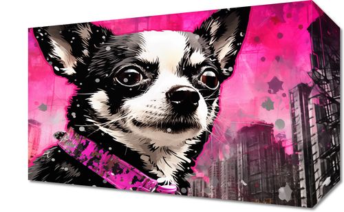 Obraz z serii pop art zatytułowany Mały Psiak o Dużej Duszy. Obraz przedstawia portret Chihuahua z intensywnym, przejmującym spojrzeniem. Pies ma charakterystyczną czarno-białą sierść, a jego oczy zdają się obserwować coś poza ramą obrazu. Ubrany jest w różową, stylową obrożę, co dodaje mu uroku. Tło w kolorze żywej magenty z elementami miejskiego krajobrazu nadaje całości miejski i nowoczesny charakter. Grafika łączy w sobie elementy realizmu z pop-artem, co sprawia, że jest ona żywa i dynamiczna. Ten obraz byłby idealnym dodatkiem do wnętrz o współczesnym designie, zwłaszcza dla miłośników zwierząt lub jako akcent kolorystyczny w modnym, miejskim mieszkaniu.