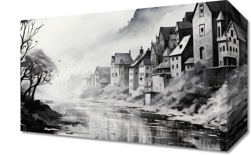 Obraz z serii pejzaże zatytułowany Mglisty Refleks. Misterne pociągnięcia pędzla przedstawiają starą wieś schowaną w mrocznych zakątkach gór, z dominującymi wieżami kościoła wznoszącymi się nad nią. Mgła otulająca krajobraz i odbicie w spokojnej wodzie tworzą atmosferę tajemniczości i zadumy. Monochromatyczna paleta barw dodaje głębi i intensywności całemu obrazowi, czyniąc go idealnym wyborem dla klasycznych salonów oraz miejsc takich jak kawiarnie o historycznym charakterze czy ekskluzywne kluby dyskusyjne.