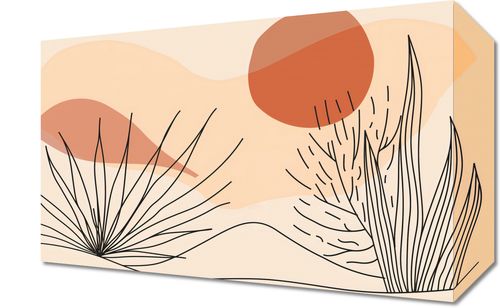 Obraz z serii boho zatytułowany Miękka Roślinność. Obraz przedstawia proste, lecz eleganckie rośliny pustynne na tle abstrakcyjnych, miękkich form i kolorów. Całość kompozycji opiera się na spokojnych odcieniach beżu, brązu oraz głębokiego terrakoty, co przywodzi na myśl ciepło i suchość pustynnego krajobrazu. Ten obraz świetnie sprawdzi się w wnętrzach o neutralnej kolorystyce, dodając im charakteru i ciepła. Idealnie nadaje się do salonu, przestrzeni wypoczynkowych lub biura, gdzie wprowadzi elementy natury i harmonii.