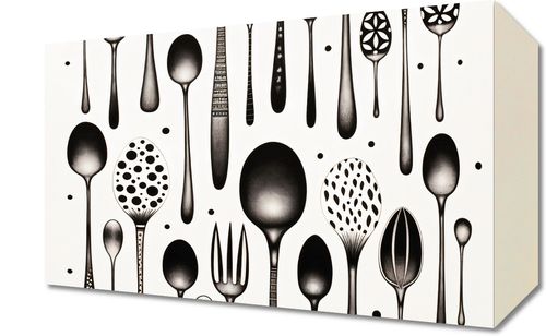 Obraz z serii wnętrza zatytułowany Narzędzia Smaku. Eleganckie sylwetki sztućców w różnorodnych kształtach i wzorach, podkreślane przez subtelne detale i geometryczne punkty, tworzą harmonijną i równocześnie zaskakującą kompozycję. Czarne i białe tony nadają prostotę i wyrafinowanie, podczas gdy unikalne projekty sztućców dodają nuty kreatywności i innowacji. Idealnie sprawdzi się w nowoczesnych kuchniach, restauracjach o minimalistycznym designie oraz w przestrzeniach dedykowanych sztuce kulinarnej.