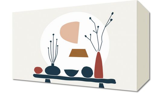 Obraz z serii boho zatytułowany Naturański Stół. Obraz to subtelna i uporządkowana prezentacja natury w stylizowanej, niemal scenicznej formie. Abstrakcyjne kształty w ciepłych i stonowanych kolorach przedstawiają wazony i rośliny na tle geometrycznych form przypominających wschód i zachód słońca. Kompozycja na neutralnym tle łączy sztukę z naturą w spójnym, współczesnym stylu. Dzieło to będzie idealnym uzupełnieniem wnętrz, w których ceniona jest prostota, ale jednocześnie szukających ciepła i naturalności. Może znaleźć miejsce w domowych salonach, jadalniach, lub jako urokliwy element w przestrzeniach biurowych, wniosąc odrobinę uroku i artystycznego nastroju.