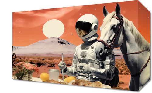 Obraz z serii pop art zatytułowany Obiad na Marsie. Ta surrealistyczna scena łączy kosmiczne eksploracje z westernowym krajobrazem, prezentując astronautę siedzącego przy stole obficie zastawionym tradycyjnymi daniami, w towarzystwie białego konia. W tle rozpościera się majestatyczna, marsjańska panorama z czerwonawym niebem i wielkim, bladym słońcem, które rzuca nieziemskie światło na śnieżnobiałe szczyty w oddali. Kaktusy i kwiaty dodają ziemi scenie namiastkę ziemskiej natury. Ten obraz to hołd dla fantastycznych wizji przyszłości, gdzie odległe światy i nasze ziemskie przyzwyczajenia spotykają się w jednej, niezwykłej rzeczywistości. Idealny dla tych, którzy cenią sobie oryginalność i odważne połączenia kulturowe.