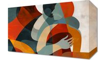 Obraz z serii abstrakcja zatytułowany Objęcia. Artystyczne przedstawienie dwóch postaci w uścisku, z wyraźnymi, płynnymi liniami i bogatą paletą kolorystyczną od ciepłych pomarańczy po chłodne odcienie błękitu i szarości. Grafika ta łączy abstrakcję z emocjonalną głębią, sugerując intymność i ciepło relacji. Idealnie komponuje się w nowoczesnych przestrzeniach mieszkalnych lub jako wyrazisty akcent w kreatywnych biurach. Ten obraz może również znaleźć miejsce w galeriach sztuki oraz w pomieszczeniach przeznaczonych do medytacji i refleksji, zachęcając do zastanowienia nad ludzką bliskością i uczuciami.