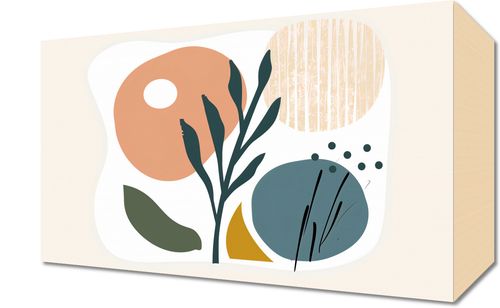 Obraz z serii boho zatytułowany Pastel Owoców.Obraz przedstawia stilizowany obraz natury, gdzie organiczne formy i kształty łączą się w nieoczywisty sposób. W kompozycji dominuje duża, pastelowa forma przypominająca owoce lub słońce, która kontrastuje z subtelnym tłem w delikatnych odcieniach beżu ozdobionym wertykalnymi liniami. Obok widnieją płynne, ciemnozielone liście oraz zaokrąglone, geometryczne formy w odcieniach szarości i musztardy, uzupełnione o subtelne graficzne akcenty. Obraz będzie pięknie komponował się w przestrzeniach poszukujących elementów natury w abstrakcyjnej, uproszczonej formie, idealnie nadając się do nowoczesnych salonów, kreatywnych przestrzeni pracy lub jako delikatny akcent w minimalistycznej sypialni.