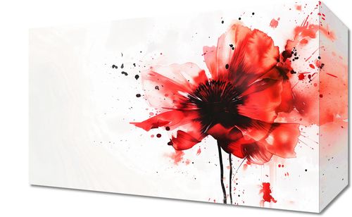 Obraz z serii abstrakcja zatytułowany Płynna Akwarela. Na obrazie przedstawiony jest kwiat w stylu akwarelowym, z dominującą czerwoną paletą barw, która przechodzi w mocne akcenty czerni w centrum kwiatu. Obraz ma dynamiczny i spontaniczny charakter, co podkreślają rozbryzgi i krople farby rozchodzące się wokół kwiatu. Przypomina to efekt plamy, który dodaje kompozycji artystycznego wyrazu i energii. Kontrast między delikatnymi czerwieniami a głęboką czerń centrum kwiatu przyciąga wzrok i czyni obraz bardzo wyrazistym. Tło jest jasne z subtelnie zaznaczonymi plamami, co dodatkowo akcentuje dramatyzm i piękno przedstawionego kwiatu.