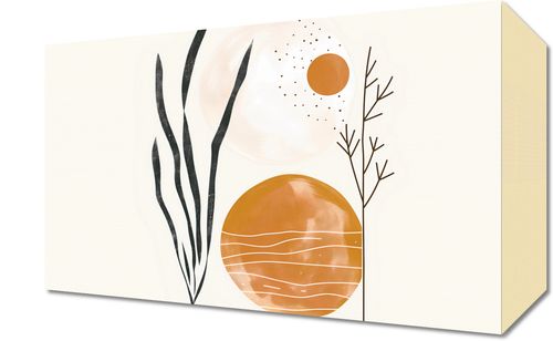 Obraz z serii wnętrza zatytułowany Przebłysk. Obraz prezentuje abstrakcyjną kompozycję o spokojnej, naturalnej kolorystyce, z dominującymi odcieniami beżu, pomarańczu i czerni. Centralne miejsce zajmują dwa okręgi, które mogą symbolizować słońce i księżyc lub inne astronomiczne ciała, z subtelnymi detalami przypominającymi krążki planetarne lub satelity. Obok nich znajdują się stylizowane rośliny lub trawy, które swoją smukłą formą i ciemnym kolorem tworzą kontrast wobec jaśniejszego tła. Dodatkowy element graficzny w postaci gałęzi z prostymi liniami przypomina drzewo lub krzew, dodając kompozycji organicznego charakteru. Całość jest utrzymana w stylistyce minimalizmu, z delikatnymi teksturami i rozpryskami, które nadają dziełu lekkości i nowoczesnego wyglądu. Ograniczona paleta barw oraz proste formy sugerują spokój i harmonię, co czyni obraz odpowiednim dla przestrzeni, które mają za zadanie inspirować do wyciszenia i refleksji.