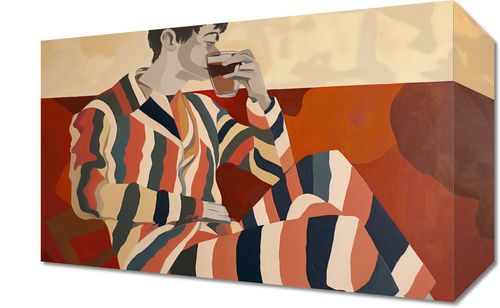 Obraz z serii abstrakcja zatytułowany Przerwa Aby Odetchnąć. Prezentuje postać mężczyzny w paskowanym szlafroku, zatopionego w degustacji filiżanki herbaty. Stylizacja grafiki nawiązuje do modernistycznej estetyki z użyciem geometrycznych kształtów i ograniczonej palety barw, co nadaje scenie spokojny i zrelaksowany nastrój. Ciepłe odcienie czerwieni i brązów w tle kompozycji podkreślają atmosferę intymności i domowego ciepła. Ten obraz idealnie wpasuje się w przestrzenie takie jak salon, biblioteka, czy przytulne zakątki do czytania i odpoczynku. Może także stanowić inspirujący akcent w kawiarniach lub herbaciarniach, gdzie zachęca do chwili oddechu i cieszenia się chwilą.