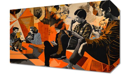 Obraz z serii pop art zatytułowany Przestrzeń Do Dialogu. Prezentuje grupę ludzi w stylizowanych retro ubraniach, zanurzonych w konwersacji i zatopionych w swoich myślach, co sugeruje głębię ludzkiego połączenia i introspekcji. Tło plakatu to geometryczne i abstrakcyjne formy w odcieniach pomarańczu, żółci i brązu, nawiązujące do lat 60. i 70. XX wieku, wprowadzając elementy vintage do nowoczesnej przestrzeni. Postacie wydają się pochłonięte rozmową, a ich pozy i gesty odzwierciedlają osobistą wymianę i komunikację. Obraz ten jest idealny do kawiarni, salonów, bibliotek, lub jako inspirujący akcent w domowych biurach, zachęcając do refleksji i twórczego dialogu.