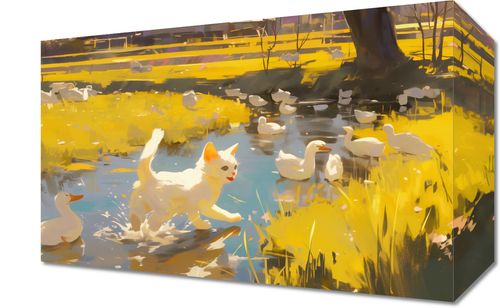 Obraz z serii abstrakcja zatytułowany Słońce na Wsi. Przedstawia idylliczną, słoneczną scenę na wsi, gdzie głównymi bohaterami są bawiący się kotek i grupa kaczek w tle. Kot, o białym umaszczeniu z jasnymi plamami, jest uchwycony w ruchu, co nadaje scenie dynamiki. Kaczki spokojnie pływają po lustrzanej tafli wody, otoczonej przez żywo żółtą trawę, co tworzy kontrast z białym kotem. Światło słoneczne rozświetla scenę, nadając jej ciepły, przyjemny nastrój. Obraz ma wyraźnie impresjonistyczny charakter, z luźnymi pociągnięciami pędzla i żywymi plamami kolorów, co czyni go atrakcyjnym dla tych, którzy cenią sobie wiejski spokój i piękno natury. Idealnie pasowałby do wnętrz, które mają na celu stworzenie atmosfery relaksu i spokoju, jak pokoje dzienne, przestrzenie odpoczynkowe, a nawet pokoje dla dzieci.