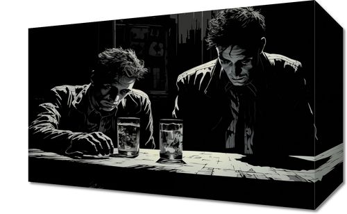 Obraz z serii abstrakcja zatytułowany Spiskowcy. Ta grafika przedstawia dwóch mężczyzn zanurzonych w głębokiej konwersacji przy barowym stole. Stylizacja na czarno-biało uchwyciła napięte, dramatyczne oświetlenie i cienie, które nadają scenie klimat tajemniczości i suspensu. Wyraźne kontury i kontrastowe światłocienie podkreślają wyraziste postaci mężczyzn i ich zacięte postawy. Obraz ten przemawia do miłośników klasycznego kina i literatury, doskonale nadając się do dekoracji przestrzeni o męskim charakterze, takich jak prywatne gabinety, domowe bary czy miejsca spotkań.