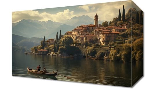 Obraz z serii pejzaże zatytułowany Spokojna Nostalgia, ten urzekający pejzaż przenosi nas do sielankowej wioski nad jeziorem, gdzie czas zdaje się płynąć wolniej. Łagodne światło rozlewające się nad architekturą wioski i gładką powierzchnią wody tworzy poczucie ciepła i spokoju. Para przemieszczająca się łodzią dodaje element ludzki, harmonijnie wpisując się w krajobraz. To dzieło sztuki idealnie nadaje się do przestrzeni, które mają na celu wprowadzenie atmosfery spokoju i refleksji, takich jak biblioteki, poczekalnie lub prywatne gabinety, zapewniając odprężającą ucieczkę od codziennego zgiełku.