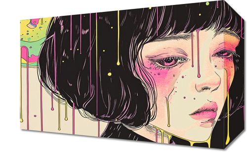 Obraz z serii pop art zatytułowany Strugi Kolorów. Ten hipnotyzujący obraz przedstawia wizerunek młodej kobiety z przymkniętymi oczami, jej twarz zdaje się być na granicy snu i jawy. Nad nią i wokół niej płyną strugi kolorów, które wydają się rozlewać jak ciecz, tworząc atmosferę oniryczną i abstrakcyjną. Kontrast między realistyczną twarzą a surrealistycznym tłem podkreśla emocjonalną głębię i złożoność ludzkich doświadczeń.Obraz ten doskonale uzupełni przestrzeń pełną kreatywności i wyobraźni, taką jak pracownie artystyczne, kawiarnie, czy nawet nowoczesne pokoje młodzieżowe. Może również stanowić niebanalny akcent w pomieszczeniach terapeutycznych lub coachingowych, gdzie rozmowa na temat emocji i wewnętrznego świata jest na porządku dziennym.