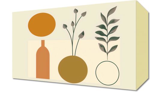 Obraz z serii boho zatytułowany Symfonia Równowagi. Obraz łączy organiczne kształty roślin z rygorystyczną formą geometrii. Prezentuje on wazony w spokojnych odcieniach brązu i złota, z których jeden jest ozdobiony gałązkami z delikatnymi pąkami, a drugi pokazuje symetryczny wzór liści. Proste linie i figury geometryczne, takie jak okrąg i prostokąt, tworzą tło dla roślinności, przypominając o ludzkiej próbie ujarzmienia natury. Całość osadzona na pastelowym tle wywołuje uczucie spokoju i harmonii. To dzieło będzie pasowało do przestrzeni, które cenią równowagę między naturą a stworzonym przez człowieka porządkiem, jak eleganckie gabinety, przestrzenie wellness lub strefy odpoczynku, które dążą do stworzenia oazy spokoju w zabieganym świecie.