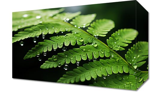Obraz z serii natura zatytułowany Szepty Natury, prezentuje zbliżenie na liść paproci okryty kropelkami rosy, które lśnią jak drogocenne klejnoty na jego witalnie zielonej powierzchni. Delikatność każdej kropli wody, zawieszonej jakby na skraju czasu, oddaje spokój i harmonię natury, jednocześnie przywołując uczucie świeżości i ożywienia. Tło obrazu jest głębokie i jednolite, co pozwala zaakcentować jasne zieleń liści i przezroczystość wody. Ten obraz może być symbolem czystości i nowych początków, idealnie wkomponuje się w przestrzenie skoncentrowane na zdrowiu i dobrostanie, takie jak gabinety lekarskie, spa, czy też jako element dekoracyjny w łazienkach i pomieszczeniach relaksacyjnych, przynosząc uczucie spokoju i odświeżenia.