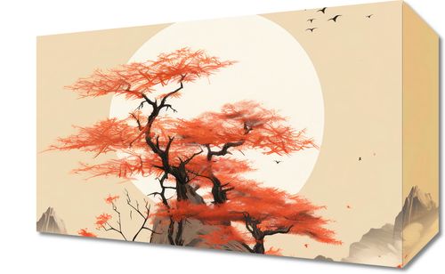 Obraz z serii pejzaże zatytułowany Szepty Wiatru. Niesamowity krajobraz z jaskrawo czerwonymi drzewami rosnącymi na majestatycznej skale, której kształty wydają się być ukształtowane przez wieki. Błyszczący biały księżyc oświetla spokojne wody, które otaczają skale, podczas gdy stado ptaków przenika przez jasne niebo, dodając uczucie przestrzeni i nieskończoności. Subtelne odcienie szarości i biele w tle tworzą kontrast dla wyrazistych czerwieni drzew, nadając scenie głębię i dramatyzm. Idealny do ozdoby salonów medytacyjnych, gabinetów terapeutycznych lub luksusowych hotelowych holów.