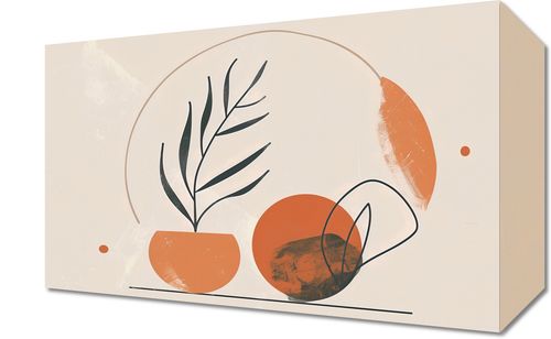 Obraz z serii boho zatytułowany Tonacja Pasteli. Obraz przedstawia harmonijną kompozycję elementów natury i abstrakcyjnych kształtów. Widzimy doniczkę z delikatną rośliną o czarnych, smukłych liściach, które delikatnie kontrastują z ciepłym odcieniem pomarańczy naczynia. Towarzyszą jej geometryczne formy: dwa krągłe kształty w tonacji ziemi, które przeplatają się, tworząc iluzję przestrzeni i głębi. Rysunek uzupełnia subtelna linia horyzontu i rozproszone kropki, dodające plakatowi dynamiki. Idealnie sprawdzi się jako element dekoracyjny w pomieszczeniach, gdzie dominuje spokój i równowaga, takich jak jasne, przestronne salony, pokoje do medytacji lub ciche zakątki bibliotek.