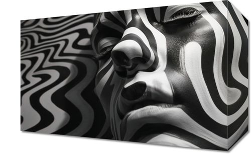 Obraz z serii abstrakcja zatytułowany Wtop Się We Mnie. Ten monochromatyczny obraz przedstawia zbliżenie na twarz kobiety, której skórę zdobią hipnotyzujące, czarno-białe wzory przypominające zebry. Skontrastowane linie zygzakowato przecinają płaszczyznę obrazu, tworząc złudzenie ruchu i głębi. Obraz jest przykładem wyrafinowanego połączenia sztuki portretowej z abstrakcyjnym designem, idealny do pomieszczeń o minimalistycznym lub nowoczesnym wnętrzu, takich jak galerie sztuki, nowoczesne biura, a także jako oryginalny akcent w domowym salonie. Jego unikalny styl przyciąga wzrok i zmusza do refleksji, stanowiąc idealny temat do rozmów w przestrzeniach społecznych.