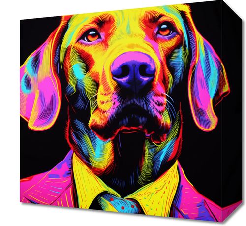 Obraz z serii pop art zatytułowany Barwna Osobowość. Ten dynamiczny portret przedstawia psa w stylu neonowym pop-artu, ubranego w elegancki garnitur z kolorowym krawatem. Intensywne, żywe barwy na czarnym tle wydobywają głębię spojrzenia i dostojność postawy psa, co nadaje temu dziełu sztuki wyjątkowy charakter. Wzór i paleta kolorów sprawiają, że obraz ten jest idealny dla współczesnych przestrzeni biurowych, designerskich mieszkań oraz galerii sztuki, które pragną dodać swojemu wnętrzu odrobinę odwagi i wyrazistości.