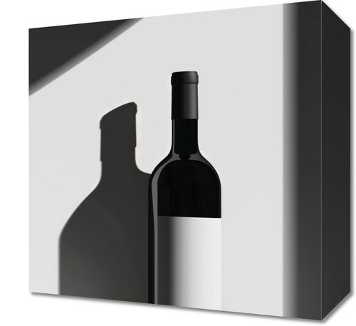 Obraz z serii wnętrza zatytułowany Butla Wina . Przedstawia minimalistyczny i elegancki wizerunek butelki wina. Kompozycja jest prosta i nowoczesna, z butelką umieszczoną na jasnym tle z ostrymi liniami cienia, które dodają głębi i zainteresowania wizualnego. Cienie są ostre i wyraźne, co sugeruje, że światło padające na butelkę jest mocne i bezpośrednie. Butelka ma klasyczną etykietę bez żadnych detali, co nadaje całemu obrazowi wyrafinowany charakter. Użycie kontrastu między ciemnymi tonami butelki a jasnym tłem podkreśla formę i sylwetkę przedmiotu, skupiając uwagę na jego zarysie. Taki obraz mógłby być świetnym dodatkiem do wnętrz urządzonych w stylu minimalistycznym lub współczesnym, a także pasowałby do przestrzeni, gdzie celebruje się kulturę wina.