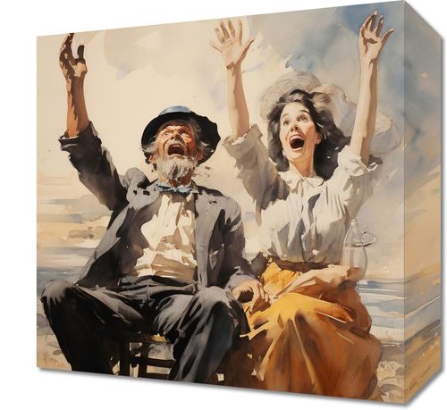 Obraz z serii wnętrza zatytułowany Chwile Radości. Pełne życia i entuzjazmu postacie starego mężczyzny w kapeluszu i młodej kobiety w białej bluzce, obaj z uniesionymi rękami w geście ekscytacji. Tło z rozmazanymi akwarelowymi chmurami i brzegiem morza dodaje uczucie swobody i nieskrępowanej radości. Złote i błękitne odcienie obrazu harmonizują ze sobą, tworząc atmosferę beztroski. Idealny do ozdobienia przestrzeni kawiarnianych, artystycznych galerii lub domowych salonów pragnących wprowadzić do swojego wnętrza nutę optymizmu i spontaniczności.