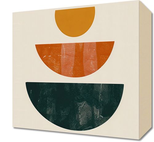 Obraz z serii boho zatytułowany Cykl Natury. Obraz przedstawia trzy przecinające się półkola, ułożone w pionowym szeregu, z których każde posiada unikalną fakturę i paletę barw - od spokojnego, złotego odcienia u góry, przez głęboką pomarańcz z akcentami ciepłej czerwieni pośrodku, do ciemnej, tajemniczej zieleni u dołu. Ta kompozycja wywołuje wrażenie harmonijnego przepływu czasu lub cykli natury. Świetnie sprawdzi się jako dekoracja w nowoczesnych przestrzeniach, takich jak minimalistyczne biura, salony w stylu skandynawskim, a także jako wyrafinowany akcent w strefach wypoczynkowych kawiarni lub butikowych hoteli.