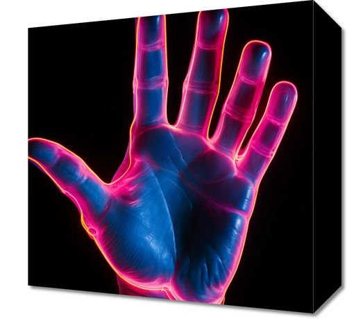 Obraz z serii pop art zatytułowany Dotyk Przyszłości. Ta hipnotyzująca grafika przedstawia ludzką dłoń w stylizacji przypominającej obrazy z tomografii komputerowej, z neonowymi konturami podkreślającymi linie i krzywizny dłoni. Żywe odcienie błękitu i różu przecinają się, tworząc dynamiczny, ale harmonijny kontrast na ciemnym tle. Ten obraz oddaje piękno ludzkiej anatomii poprzez futurystyczną estetykę, zachęcając do refleksji nad połączeniem sztuki, nauki i technologii. Idealny dla nowoczesnych przestrzeni, gdzie innowacja i design idą w parze.