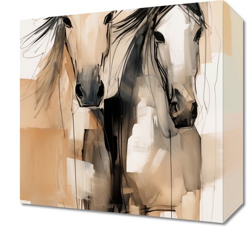 Obraz z serii wnętrza zatytułowany Dusze na Wolności. Ten artystyczny obraz przedstawia dwie abstrakcyjne sylwetki koni, uchwycone w dynamicznych, niemal eterycznych pociągnięciach pędzla. Neutralna paleta barw z dominującymi odcieniami beżu i czerni, podkreślona jest przez akcenty i plamy, co nadaje dziełu głębi i tekstury. Artystyczne, swobodne linie i plamy tuszu tworzą wrażenie ruchu i wolności, wywołując emocjonalne rezonanse z widzem. Obraz jest idealnym wyborem dla miłośników koni, sztuki współczesnej i abstrakcyjnego ekspresjonizmu, będąc nie tylko dekoracją, ale także wyrafinowanym elementem w przestrzeniach takich jak salony, biura, czy galerie sztuki.