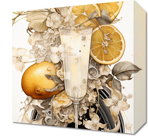 Obraz z serii wnętrza zatytułowany Esencja Cytrusów. Zmysłowy pejzaż ukazuje krystaliczną szampanową kieliszek otoczony bujnym kwiatem i soczystymi plasterkami cytryny. Delikatne białe kwiaty i misternie rysowane detale dodają kompozycji głębi i subtelności, podczas gdy wyraziste żółte akcenty cytryny dodają energii i świeżości. Całość wprowadza w stan relaksu i orzeźwienia, przypominając o chwilach spędzonych na letnich tarasach. Idealnie wpasuje się w eleganckie restauracje, bary koktajlowe lub nowoczesne kawiarnie z akcentami śródziemnomorskimi.