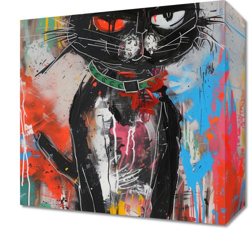 Obraz z serii abstrakcja zatytułowany Gburowaty Kiciak to odważne, street artowe przedstawienie czarnego kota z intensywnymi, czerwonymi oczami. Postać kota, zarysowana grubymi, dynamicznymi liniami, wyróżnia się na tle żywego, kolorowego graffiti. Dzieło łączy w sobie surowość miejskiego stylu z komicznym przedstawieniem zwierzęcia, co nadaje mu niepowtarzalny charakter. Drobne białe akcenty na sierści kota oraz wyraziste spojrzenie tworzą efekt, który przyciąga i utrzymuje wzrok obserwatora. Ten obraz, pełen energii i miejskiego ducha, doskonale odzwierciedla współczesną kulturową estetykę i będzie stanowił wyrazisty element dekoracyjny w nowoczesnych przestrzeniach takich jak loftowe apartamenty, kawiarnie i przestrzenie kreatywne.