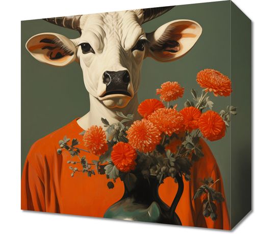 Obraz z serii wnętrza zatytułowany Harmonia Kontrastów. Byk o majestatycznym wyglądzie z intensywnym spojrzeniem, podkreślany przez imponujące rogi i białą sierść, staje w kontraście z delikatnością kwiatów pomarańczowych, które zdobią jego otoczenie. Pomarańczowa tunika, którą nosi, łączy się z barwą kwiatów, tworząc jednolitą paletę barw. Te zaskakujące połączenie elementów dodaje obrazowi nuty fantazji i oryginalności. Idealnie wpisuje się w nowoczesne wnętrza oraz galerie sztuki, gdzie ekscentryczność i kreatywność są na pierwszym planie.