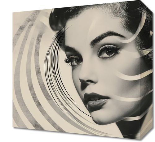 Obraz z serii pop art zatytułowany Ikonka Kina. Przedstawia czarno-białe portretowe zdjęcie klasycznej gwiazdy filmowej, której twarz jest częściowo zakryta przez geometryczny wzór spiralnych linii. Linie te dodają obrazowi dynamiki i nowoczesnego akcentu, kontrastując z retro estetyką portretu. Ten obraz łączy stare z nowym, sugerując zarówno ponadczasową piękność, jak i współczesne spojrzenie na sztukę. Idealny do eleganckich, miejskich przestrzeni lub jako dekoracja dla miłośników klasycznego kina.