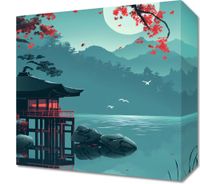 Obraz z serii motywy wschodnie zatytułowany Japoński Pawilon. Ten obraz emanuje spokojem dzięki scenie przedstawiającej tradycyjny japoński pawilon, otoczony przez wodę i delikatnie pochylające się czerwone liście klonu. Ciepłe światło wschodzącego księżyca i subtelne odbicie w wodzie podkreślają atmosferę ciszy i refleksji. Delikatne sylwetki przelatujących ptaków dodają element życia i ruchu. Obraz ten idealnie wpisuje się w przestrzenie współczesne, minimalistyczne, a także te, które celebrują naturę i spokój, takie jak pokoje do medytacji, jadalnie, czy też poczekalnie w spa.