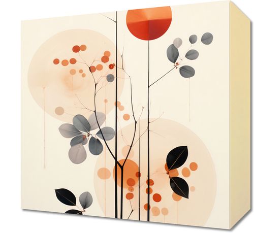 Obraz z serii wnętrza zatytułowany Jesienna Melodia. Subtelne motywy roślinne, z delikatnymi liśćmi w odcieniach niebieskiego, są otoczone przez okrągłe formy w odcieniach pomarańczy i beżu, które przypominają wschodzące słońce czy pełnię księżyca. Cienkie gałązki przecinają kompozycję, dodając jej struktury i rytmu. Ciepłe tony mieszają się z chłodniejszymi, tworząc harmonijną i spokojną całość. Jego wyrafinowany i subtelny design wprowadza atmosferę relaksu i spokoju. Idealnie pasuje do domowych salonów, gabinetów relaksacyjnych czy też nowoczesnych biur, gdzie natura łączy się z elegancją i prostotą.