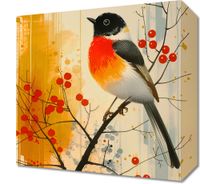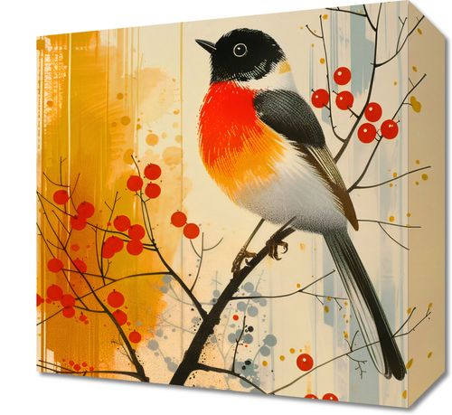 Obraz z serii abstrakcja zatytułowany Jesienny Rudzik przedstawia kolorowego ptaka, prawdopodobnie rudzika, siedzącego na gałęzi w otoczeniu jesiennych owoców i liści. Ptak jest szczegółowo narysowany z wyraźnymi kolorami, podkreślającymi jego piękno i elegancję, a jego poza jest pełna wdzięku i spokoju. Tło obrazu w ciepłych odcieniach żółci i oranżu, przypomina złotą paletę jesieni, z akcentami w postaci delikatnych kropelek i smug farby, które dodają dziełu głębi i tekstury. Całość kompozycji jest harmonijna i pełna spokoju, idealna do przestrzeni, które chcą wnieść element natury i spokojnego piękna do swojego wnętrza, takich jak salony, gabinety relaksacyjne, czy przestrzenie o tematyce przyrodniczej.