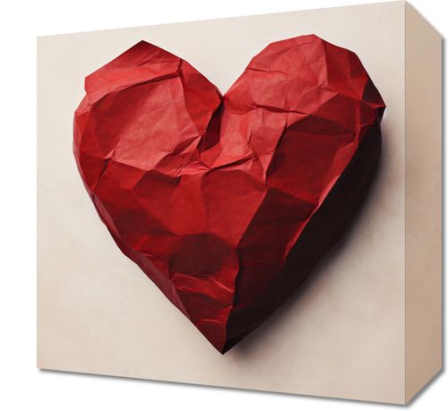 Obraz z serii wnętrza zatytułowany Kreślone Serce. Delikatne fałdy czerwonego papieru układają się w kształt serca, symbolizując skomplikowane, ale głębokie emocje. Nieregularne załamania i zgięcia dodają obrazowi tekstury i głębi, przypominając o wrażliwości i kruchości ludzkich uczuć. Pastelowe tło kontrastuje z intensywną czerwienią, podkreślając subtelność i ciepło kompozycji. Ten wyjątkowy i wzruszający projekt doskonale pasuje do romantycznych sypialni, salonów relaksacyjnych, a także miejsc związanych z terapią emocjonalną i sztuką.