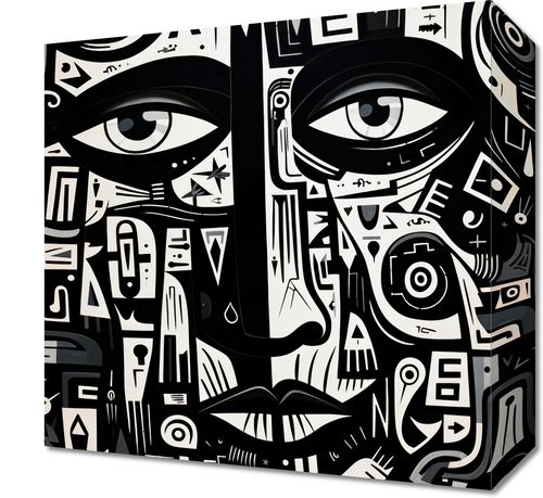Obraz z serii abstrakcja zatytułowany Labirynt Myśli. Intrygujące oczy spoglądające z głębi obrazu są otoczone złożonymi wzorami i symbolami, które łączą się, tworząc enigmatyczny portret. Czarno-białe barwy kontrastują ze sobą, dodając dziełu intensywności i głębi. Złożoność wzorów symbolizuje skomplikowane myśli i emocje, które kryją się za ludzkim spojrzeniem. Świetnie sprawdzi się w nowoczesnych biurach, galeriach sztuki oraz w przestrzeniach przeznaczonych dla miłośników abstrakcyjnej ekspresji.